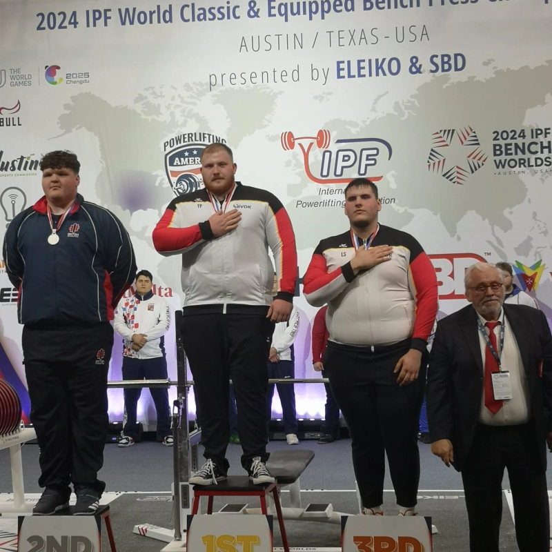 WM im Bankdrücken in Austin Texas Junioren Klasse +120 Felix Pfleiderer Gold vom KSC Leintal und Luca Streif vom KSV Renchtal Bronze und Gerhard Baumeister vom AC Weinheim ebenfalls Gold und wir haben noch zwei Kannidaten dort die Chance auf dem WM Titel haben BWG Athleten vertreten würdig unseren Verband